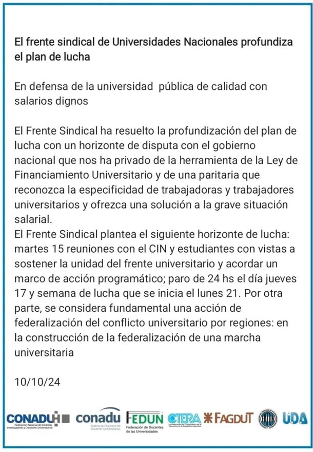"El Frente Sindical ha resuelto la profundización del plan de lucha con un horizonte de disputa con el gobierno nacional que nos ha privado de la herramienta de la Ley de Financiamiento Universitario", se informó a través de un comunicado.