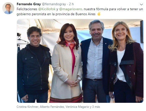 “Felicitaciones @Kicillofok y @magariovero, nuestra fórmula para volver a tener un gobierno peronista en la provincia de Buenos Aires”, escribió Gray en su Twitter.