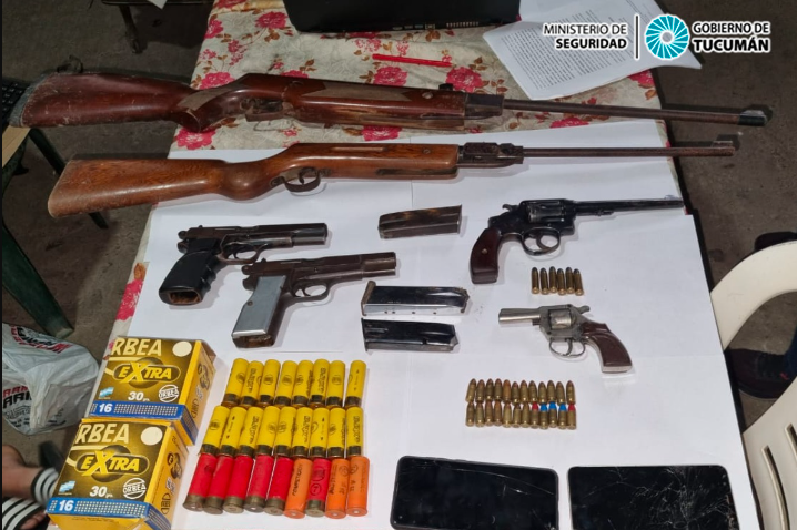 En el procedimiento, realizado en seis inmuebles ubicados en inmediaciones del cruce de calle Belisario López con pasaje 20 de Junio, en San Cayetano, secuestraron un auto, 10 celulares, 2 rifles de aire comprimido, 2 pistolas semiautomáticas, 2 revólveres de diversos calibres, 14 tarjetas, entre crédito y débito, y más de 50 cartuchos de escopeta. Además, dos personas, presuntamente relacionadas a la causa, fueron aprehendidas.