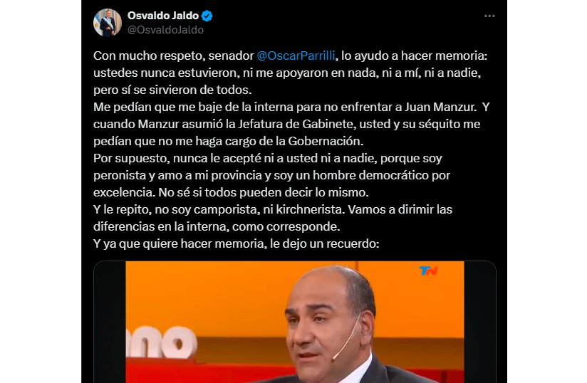 El gobernador, Osvaldo Jaldo, le respondió con un ayudamemoria de por medio. El mandatario escribió: "Con mucho respeto, senador @OscarParrilli, lo ayudo a hacer memoria: ustedes nunca estuvieron, ni me apoyaron en nada, ni a mí, ni a nadie, pero sí se sirvieron de todos".