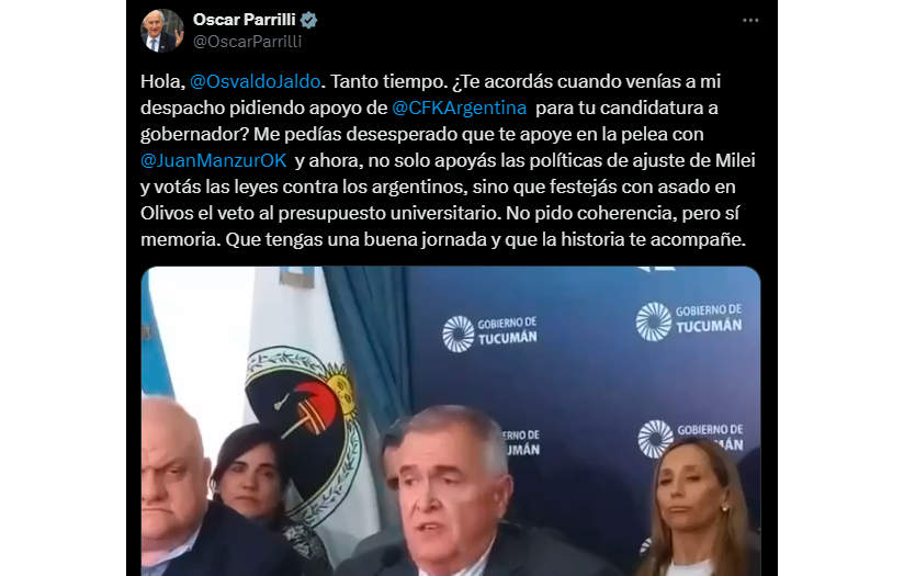 Parrilli posteó: "Hola, @OsvaldoJaldo. Tanto tiempo. ¿Te acordás cuando venías a mi despacho pidiendo apoyo de @CFKArgentina para tu candidatura a gobernador? Me pedías desesperado que te apoye en la pelea con @JuanManzurOK, y ahora, no solo apoyás las políticas de ajuste de Milei y votás las leyes contra los argentinos, sino que festejás con asado en Olivos el veto al presupuesto universitario. No pido coherencia, pero sí memoria. Que tengas una buena jornada y que la historia te acompañe".