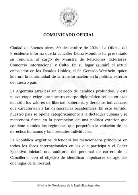 Javier Milei decidió echar a su canciller Diana Mondino luego de que Argentina votara, consecuentemente con su historia, en rechazo al bloqueo contra Cuba en la asamblea de Naciones Unidas. La salida de la ministra de Relaciones Exteriores, Comercio Internacional y Culto fue confirmada a Página/12 por una fuente cercana al presidente Milei. Al parecer, Gerardo Werthein, actual embajador argentino en Washigton DC, está cerca de ser el reemplazante de Mondino.