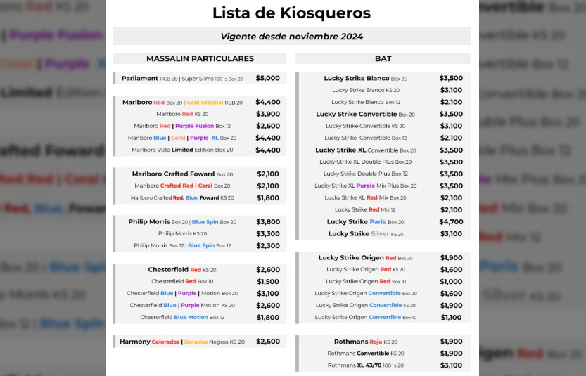 Desde este sábado 9 de noviembre, la tabacalera Massalin Particulares aplicará un aumento promedio del 10% en todos sus productos. El último ajuste de precios ocurrió en septiembre, y este es el séptimo aumento de 2024. Esta actualización rige en todo el país.