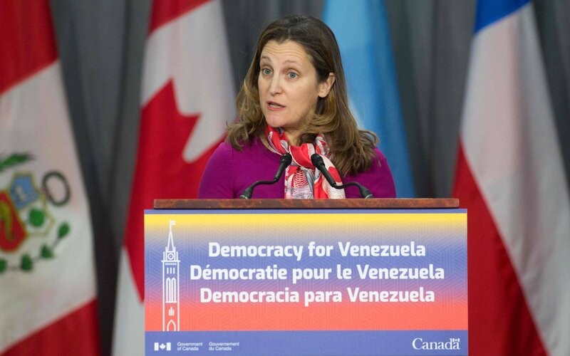 Freeland también dijo que Canadá está "evaluando el estatuto de los diplomáticos venezolanos nombrados por el régimen de Maduro en Canadá".