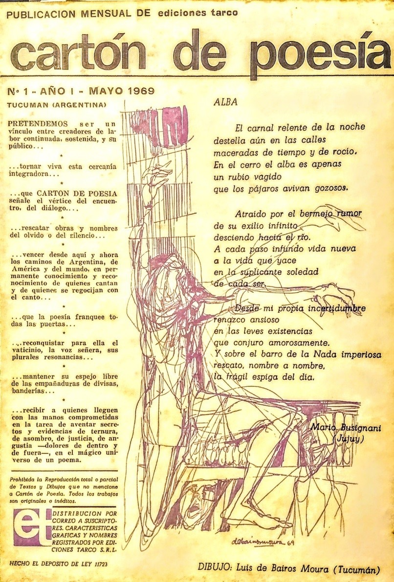 “Cartón nace un día de otoño, en mayo de 1969, en la Peña El Cardón que tenía por entonces su sede en el subsuelo del edificio del Jockey Club. La elegimos por lo emblemático de esa institución de la que formábamos parte. Eran los tiempos de Gustavo Bravo Figueroa, infatigable promotor y “custodio” de tan prestigiosa entidad. Como el sistema que ideamos de distribución era el de suscripciones y por correo, decidimos que, en el acto de presentación, un cartero con su uniforme y caja de cuero portasobres en bandolera, fuera quien entregara a los presentes el número uno. Habíamos conseguido del correo una respuesta satisfactoria al pedido de tarifa especial reducida. Así Carola Briones, Manuel Serrano Pérez y yo, presentamos el N° 1 de Cartón de poesía”, relató Carlos Duguech.