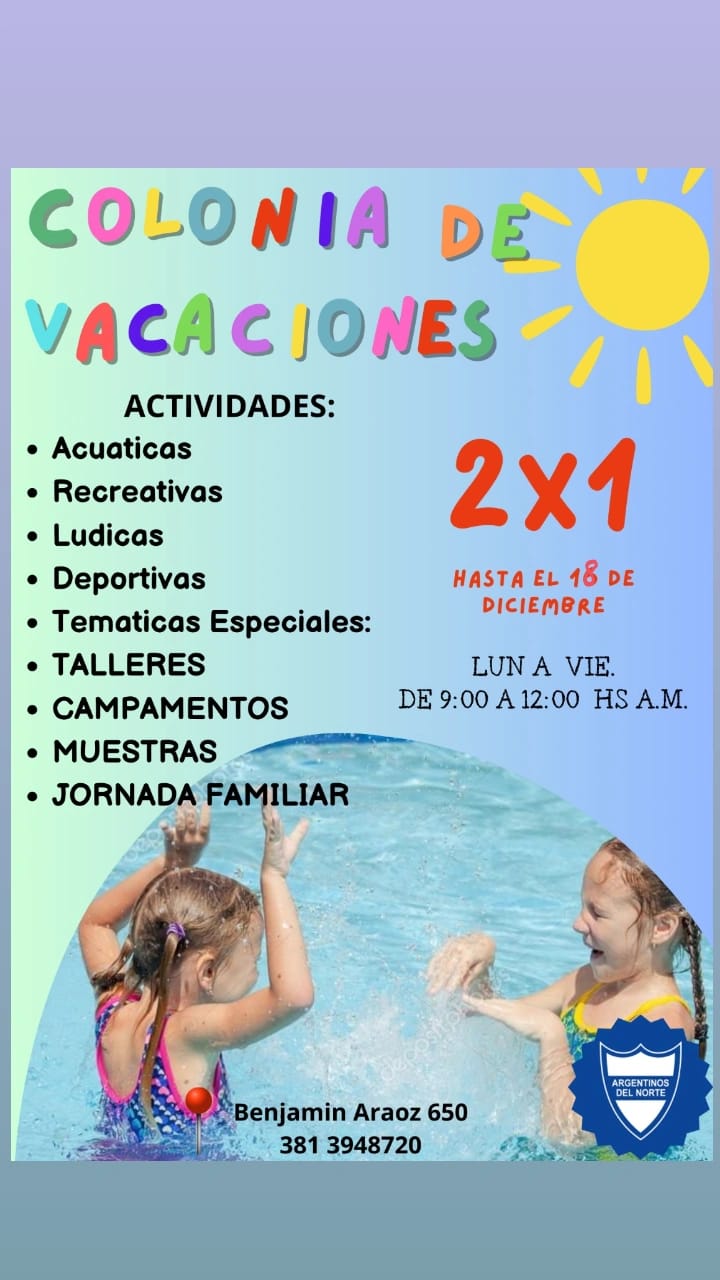 La Colonia de vacaciones “Tiburoncín”, abrirá sus puertas el próximo lunes 16 de diciembre en “el club Argentinos del Norte”, que está en Benjamín Araoz 650. “Esto va a funcionar de 9 a 12, y van a ser diferentes las actividades que van a realizar los chicos a partir del lunes”. De lunes a viernes de 9 a 12 am a partir del lunes 16 de diciembre y hasta el 28 de febrero.