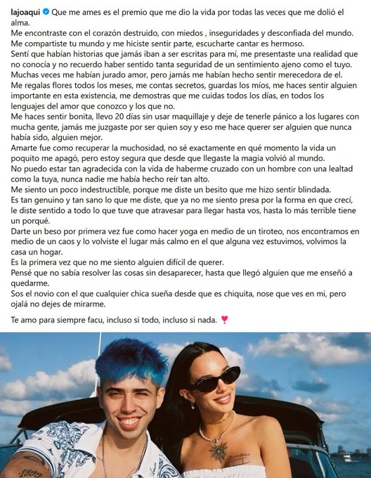 La cantante no ocultó cómo su vínculo la ayudó a recuperar la confianza: “Sentí que habían historias que jamás iban a ser escritas para mí. Muchas veces me habían jurado amor, pero jamás me habían hecho sentir merecedora de él. Me hacés sentir bonita, llevo 20 días sin usar maquillaje y dejé de tenerle pánico a los lugares con mucha gente", agregó, resaltando los pequeños gestos diarios que construyen su relación.