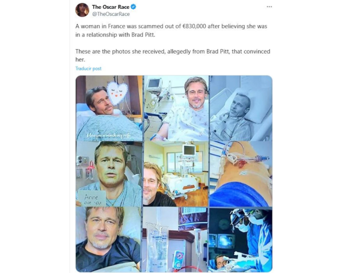 La imagen de Brad Pitt fue utilizada para estafar económicamente a una mujer francesa a través de las redes sociales. La víctima de 53 años, identificada como Anne, fue engañada durante un año y medio y perdió un total 830.000 euros. Una situación similar ya había ocurrido meses atrás en España.