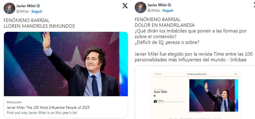 En la mañana del miércoles, el presidente de la Nación, Javier Milei, volvió a manifestarse en redes sociales para vanagloriarse y apuntar contra sus detractores después de que sea reconocido como una de las 100 personas más influyentes del mundo.