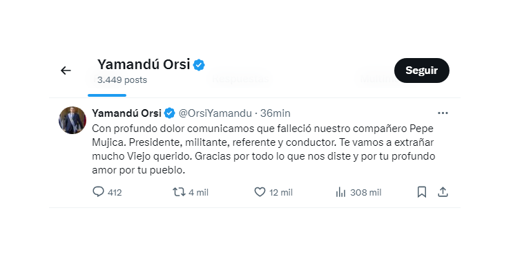 La noticia fue confirmada por Yamandú Orsi, a través de su cuenta de X. Padecía cáncer de esófago.