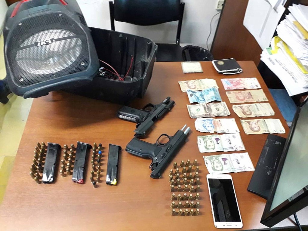 Antes de ser atrapados, y al advertir la cercanía de los uniformados, el sujeto que viajaba como acompañante a bordo del rodado, arrojó un parlante portátil. Cuando los uniformados levantaron el artefacto, advirtieron que era muy pesado. Al desmontarlo, descubrieron que en su interior había dos armas de fuego, con los cargadores completos y otras 40 municiones.