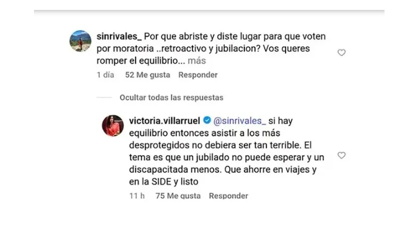En una serie de respuestas desde su cuenta oficial de Instagram, realizadas el viernes por la noche, sostuvo que el Gobierno debería "ahorrar en viajes y en la SIDE "antes que recortar en jubilaciones o pensiones por discapacidad.