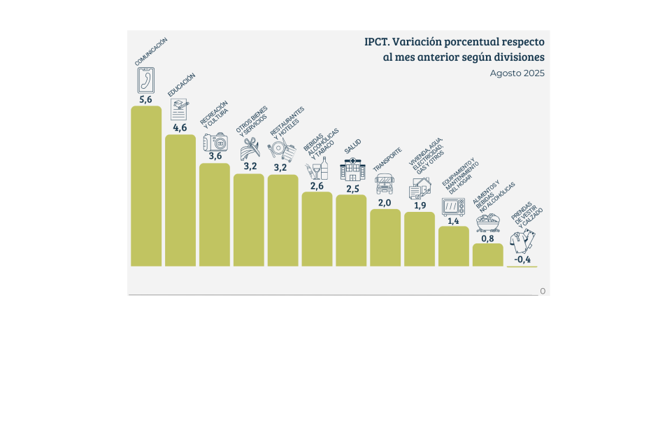 La variación interanual (agosto 2025 comparado con agosto 2024) del nivel general es de 32,2%. La mayor variación para este período se observa en la categoría “Educación” (108,3%) seguida por “Vivienda, agua, electricidad, gas y otros combustibles” (62,3%).
