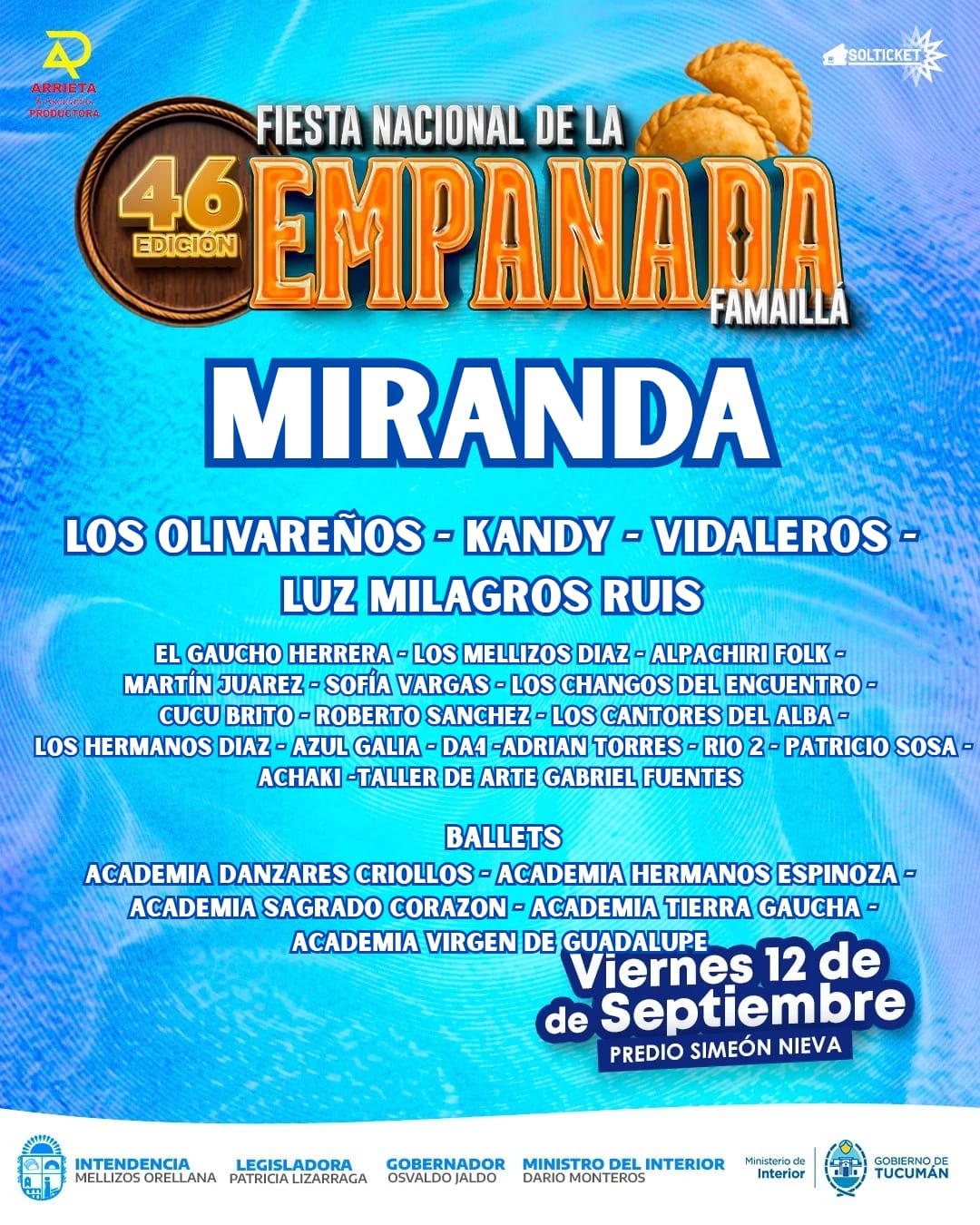 La 46ª edición de la Fiesta Nacional e Internacional de la Empanada, más allá del campeonata, trae este 2025, "una cartelera maravillosa, arrancamos el viernes con Miranda, sábado Dyango con Destino San Javier. El domingo es gratis a la mañana, mientras las chicas están haciendo la competencia desde las 9 de la mañana hasta las 2 de la tarde. La gente puede ir a presenciar cómo compiten las chicas en el campeonato. La destreza", dijo la directora de prensa.