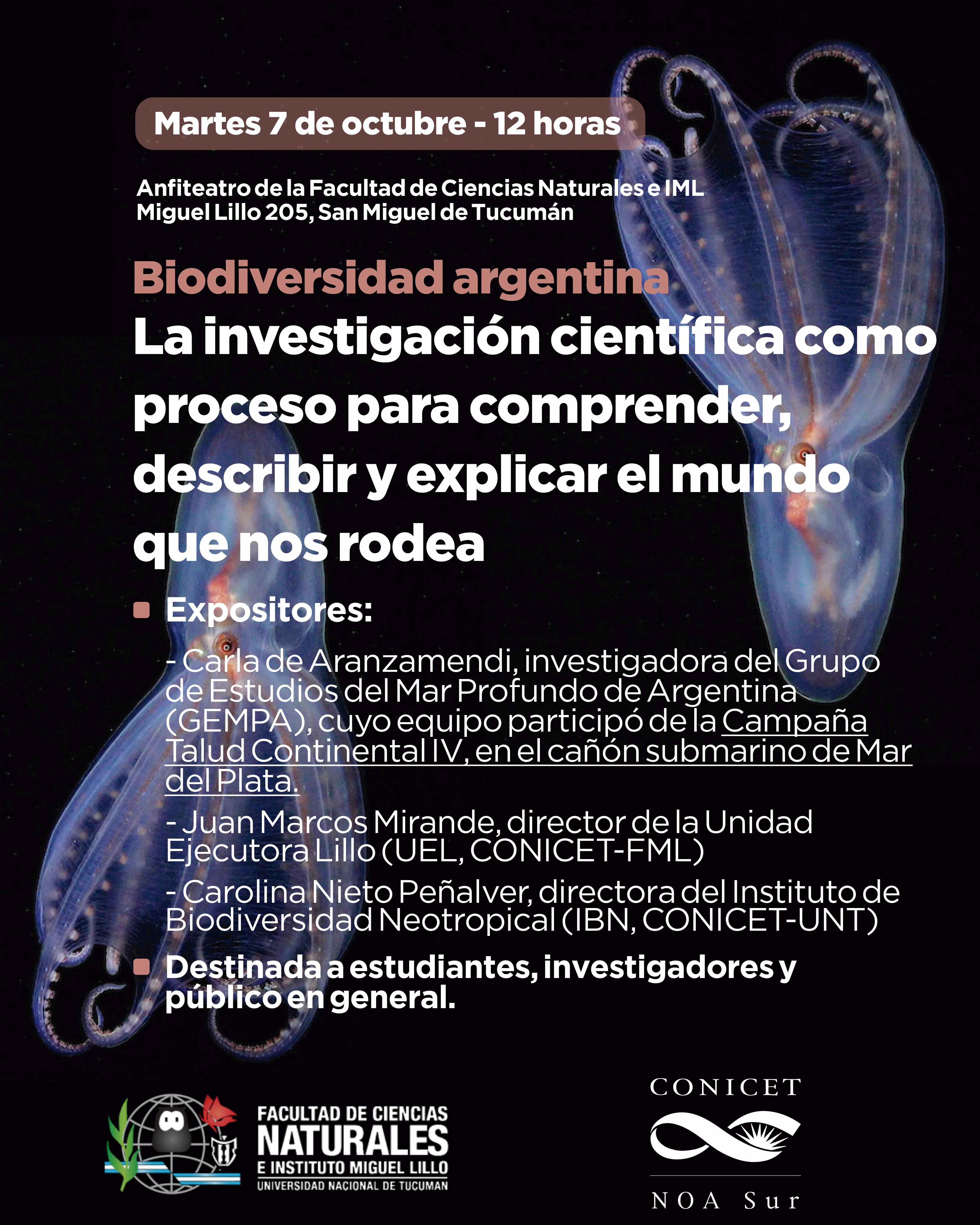 La visita de Aranzamendi se produjo en el marco de la conferencia “Biodiversidad argentina: la investigación científica como proceso para comprender, describir y explicar el mundo que nos rodea”, que se desarrollará este martes 7 de octubre en el Anfiteatro de la Facultad de Ciencias Naturales e IML (Miguel Lillo 205). La disertación estará destinada a estudiantes, investigadores y público en general, y contará con la participación de Juan Marcos Mirande, director de la Unidad Ejecutora Lillo (CONICET–FML); y Carolina Nieto Peñalver, directora del Instituto de Biodiversidad Neotropical (CONICET–UNT).