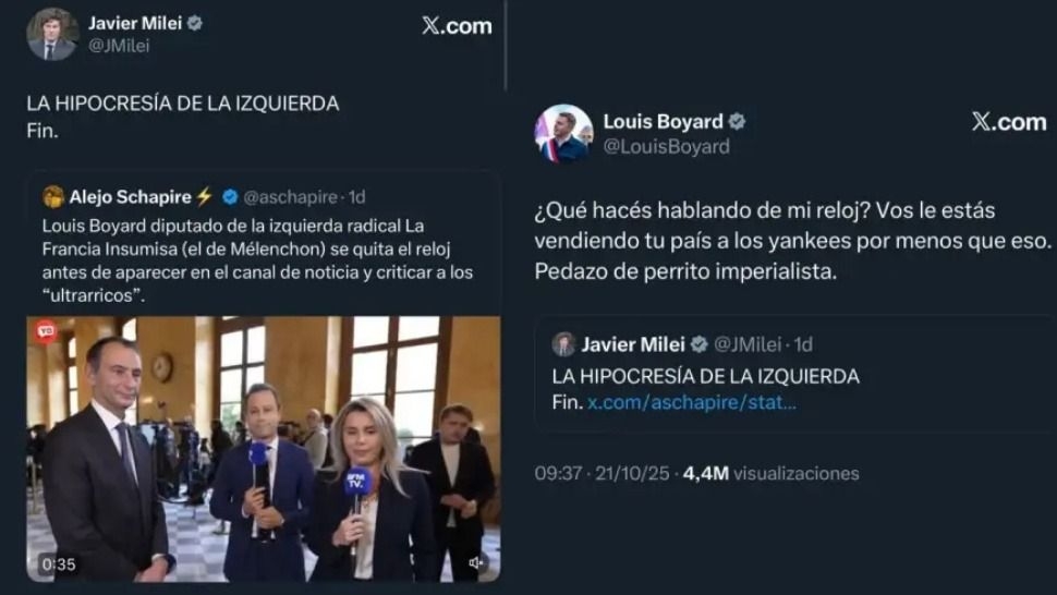 El cruce se originó el jueves 16 de octubre en el Parlamento francés, cuando Boyard fue captado por las cámaras quitándose discretamente un reloj antes de brindar una entrevista al canal BFMTV. El gesto se viralizó rápidamente en redes sociales y fue aprovechado por el mandatario argentino, quien compartió el video desde su cuenta oficial de X (ex Twitter) con un mensaje irónico. “La hipocresía de la izquierda. Fin”, escribió Milei, acompañando las imágenes del legislador.