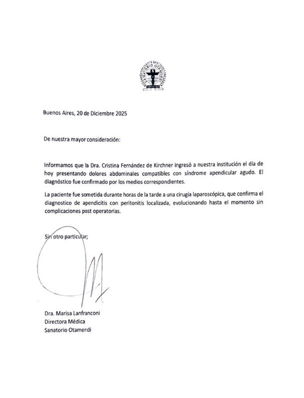 Luego de que trascendiera la situación de salud de la expresidenta, la Dra. Marisa Lanfranconi -directora médica del Sanatorio Otamendi- emitió el parte médico oficial: "Informamos que la Dra. Cristina Fernández de Kirchner ingresó a nuestra institución el día de hoy presentando dolores abdominales compatibles con síndrome apendicular agudo. El diagnóstico fue confirmado por los medios correspondientes", comienza el escrito.