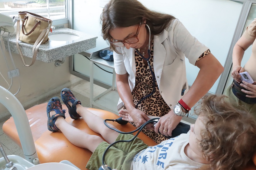 Entre los controles que incluye la ficha médica completa se encuentran la medición de la tensión arterial, la evaluación cardiológica, la revisión de columna y pisada, el control de peso y talla, la verificación del carnet de vacunación, el control oftalmológico —que se realiza en el Hospital Oftalmológico de la Facultad de Medicina— y la evaluación odontológica, a cargo de la Facultad de Odontología.
