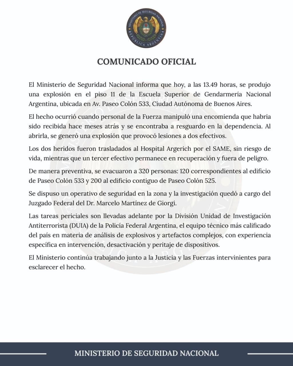 El Ministerio de Seguridad Nacional que encabeza Alejandra Monteoliva difundió un comunicado en redes sociales luego del incidente en la Escuela Superior de Gendarmería. "El hecho ocurrió cuando personal de la Fuerza manipuló una encomienda que habría sido recibida hace meses atrás y se encontraba a resguardo en la dependencia. Al abrirla, se generó una explosión que provocó lesiones a dos efectivos", detalló.
