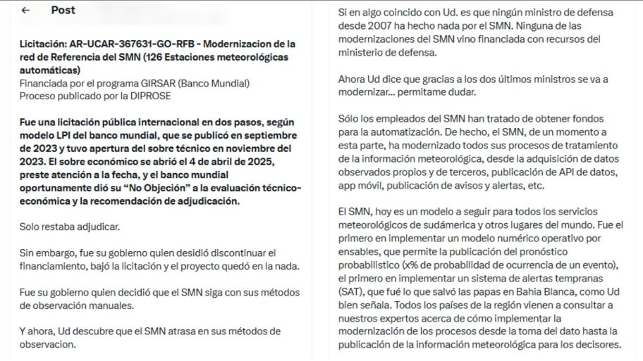 En su mensaje, también vinculó la reforma con la necesidad de fortalecer los sistemas de alerta temprana ante fenómenos extremos. Mencionó episodios recientes como los ocurridos en La Plata y Bahía Blanca para subrayar que una modernización del organismo permitiría mejorar la capacidad de anticipación y respuesta frente a emergencias climáticas.