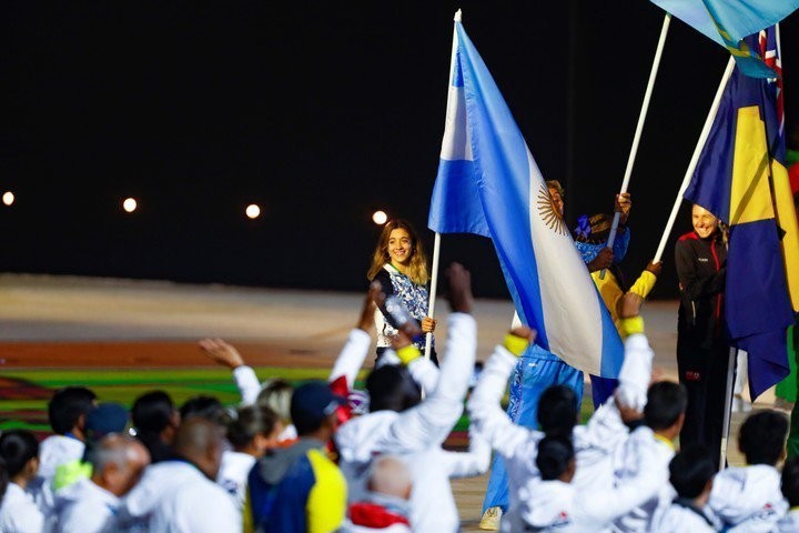 La abanderada fue Delfina Pignatiello, quien ganó tres preseas doradas durante las competencias: 400 metros estilo libre, 800 metros estilo libre y 1500 metros estilo libre. La nadadora de 19 años encabezó el desfilo y se llevó un recuerdo imborrable.