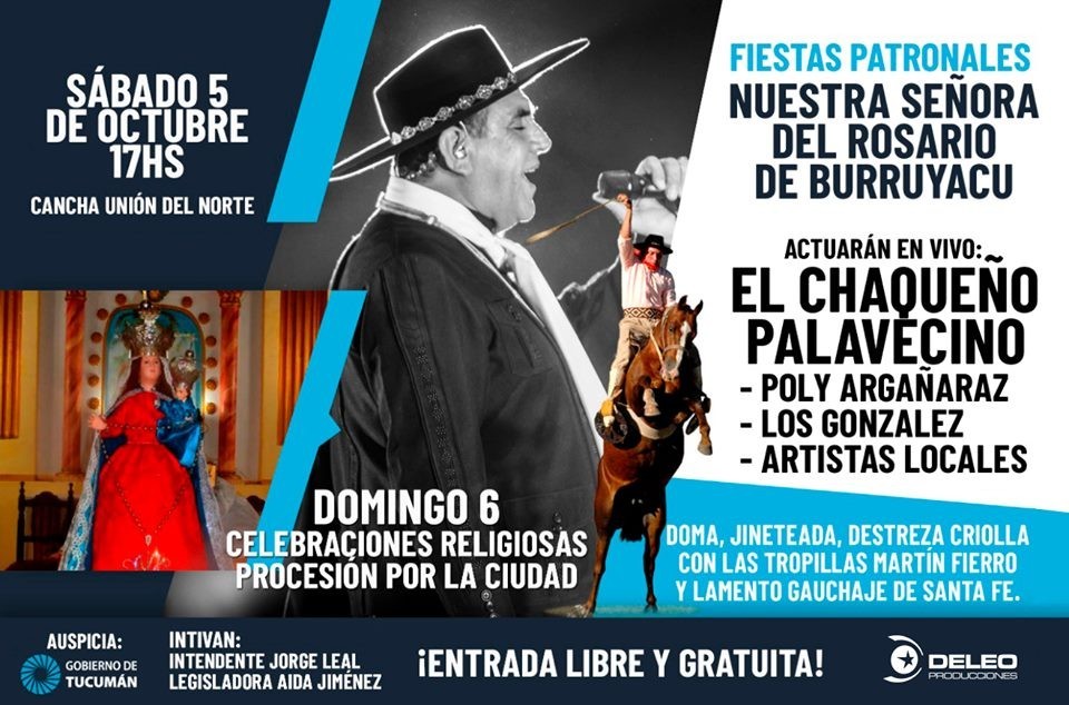 Con un fervor religioso que conmueve hasta al más escéptico, las fiestas patronales son un sello distintivo de Tucumán. Se espera la llegada de miles de personas de todo el NOA para participar de la vigilia con la que se realizará el primer domingo de octubre, dedicado a la Virgen Patrona de Burruyacú. La vigilia que a medianoche contemplará la salida desde la Iglesia de Nuestra Señora del Rosario, para en procesión llegar al Club Unión del Norte en el que se realizará el festival folklórico, con entrada libre y gratuita, con la presentación de diversos grupos folklóricos, entre ellos el Chaqueño Palavecino, Poly Argañaraz y Los Gonzalez entre muchos otros artistas.