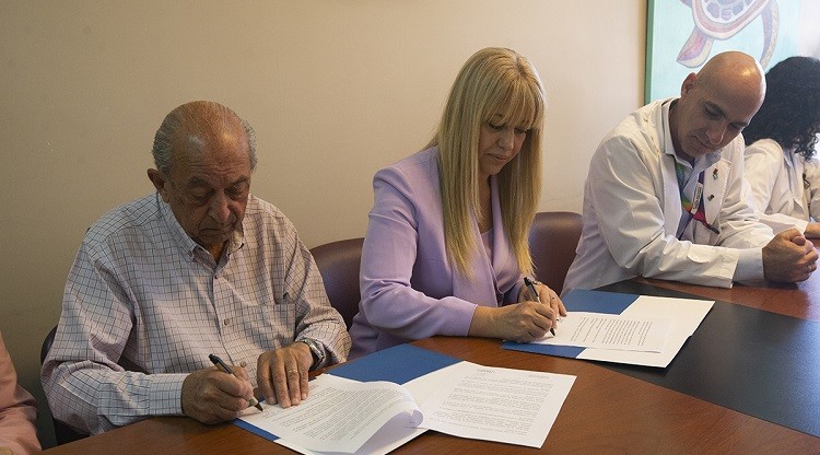 La ministra de Salud, Rossana Chahla; el presidente del Consejo de Administración del hospital de Pediatría S.A.M.I.C. “Prof. Dr. Juan P. Garrahan”, Carlos Kambourian; y Jorge V. Menehem, de la Fundación, en Buenos Aires rubricaron un convenio que tiene como objetivo promover y desarrollar acciones en forma conjunta para disminuir la morbilidad y mortalidad materno infantil, con la implementación de programas de colaboración, asistencia y capacitación