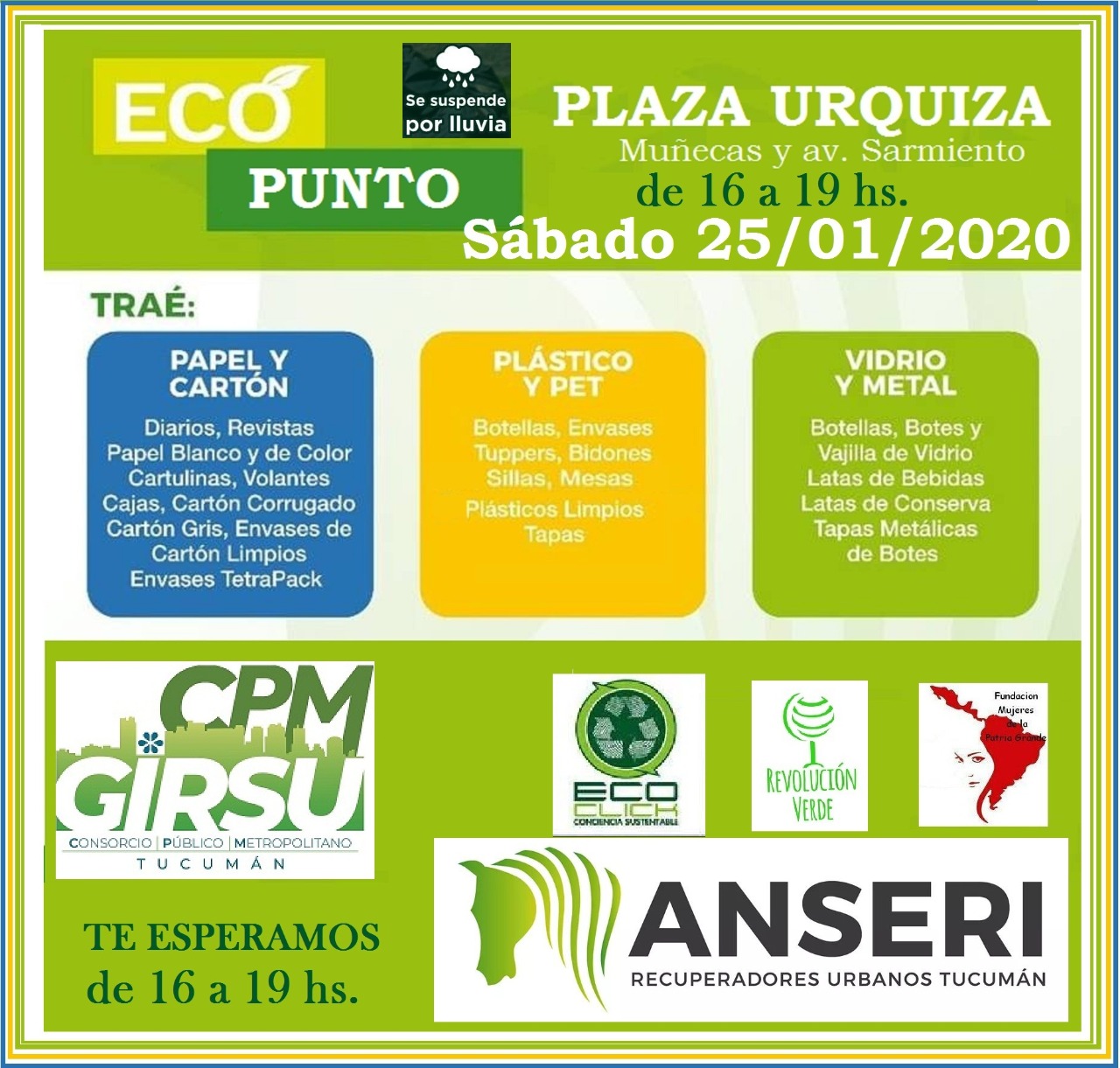 Serán dos los EcoPuntos para que lleves todos los materiales reciclables que se encuentran en tu casa. En San Miguel de Tucumán podrán acercar los residuos limpios y secos al stand que montarán los trabajadores de la cooperativa de Recuperadores de Residuos Sólidos Urbanos "Aquí Nadie se Rinde" (ANSERI) en conjunto con el Consorcio Público Metropolitano en la plaza Urquiza. Los yerbabuenenses, en tanto, podrán aprovechar el ecocanje organizado por la Secretaría de Servicios Públicos y Medio Ambiente del municipio en la Plaza Beirut, ubicada en avenida Perón primera cuadra.    En el caso del EcoPunto de ANSERI, los interesados pueden llevar todo tipo de materiales reciclables al stand que estará habilitado de 16 a 19 en la esquina de avenida Sarmiento y Muñecas. Durante la jornada, también se podrá colaborar colocando en una urna billetes de $5 que pronto saldrán de circulación.    Según Merry Anastasio, referente de la cooperativa que nuclea a los recuperadores urbanos, "el dinero recaudado será destinado al fondo que están armando para adquirir una camioneta que les permita implementar la recolección diferenciada de residuos en determinadas rutas o circuitos de zona Norte y Sur de San Miguel de Tucumán". Cabe recordar que ANSERI surgió con la premisa de sustituir la tracción a sangre en San Miguel de Tucumán a través de la creación de plantas de reciclaje o centros verdes que generen oportunidades para las familias que actualmente necesitan de un carro de tracción a sangre para generar recursos.           Por otra parte, en Yerba Buena, tienen la posibilidad de canjear sus reciclables por compost o fertilizante líquido que se produce en el vivero de la Ciudad Jardín, localidad que cuenta con una planta de reciclaje que genera empleo para una decena de familias. La actividad se desarrollará este sábado, de 17 a 19, en la plaza Beirut de avenida Perón primera cuadra y se suspenderá sólo en caso de lluvia.