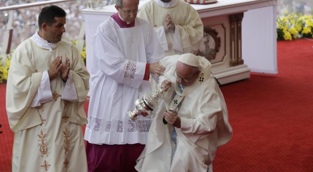 “Se ha levantado, tranquilos que el papa está bien”, aseguró Burke. El papa está próximo a cumplir 82 años, y varias veces se ha tropezado en distintas circunstancias, como en 2016 en Polonia (foto).