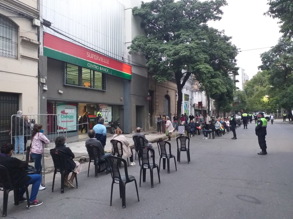 Con la Fiscalía de Salud Pública al frente, a cargo del Fiscal Carlos Picón y con el aporte de 500 efectivos por parte de las fuerzas policiales, en la mañana de hoy se vive una jornada de mucho orden en la city bancaria, claras disposiciones de higiene, con asientos dispuestos en las afueras de las entidades bancarias, con el tránsito vehicular cortado, y accediendo al lugar de espera sólo aquellas personas que deben percibir sus haberes, es decir con documentos terminados en 6 y 7. El resto es invitado a retirarse.