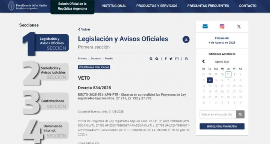 Oficializaron el veto en bloque de las tres leyes sociales aprobadas por el Congreso
