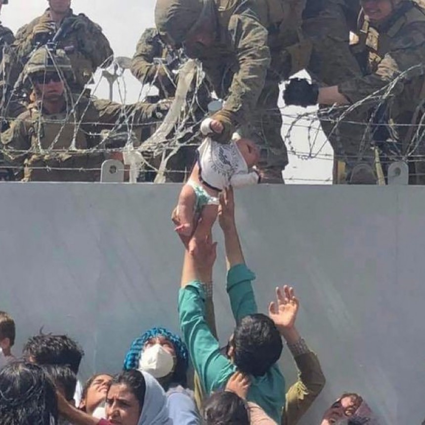 Un video desgarrador que muestra a un infante de marina estadounidense levantando a un bebé por encima de una pared cubierta de alambre de púas en el aeropuerto.