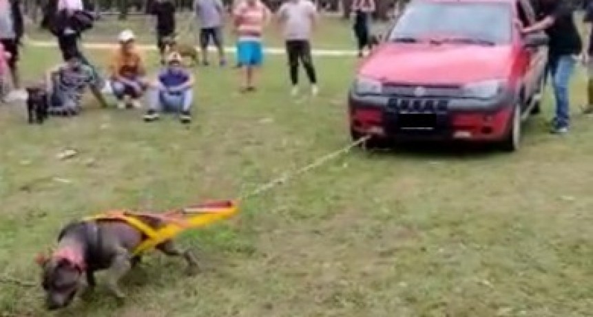 Maltrato animal: Puso a un Pitbull a tirar un automóvil y ahora es investigado