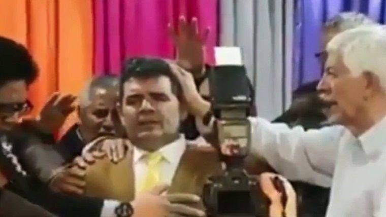 El diputado salteño Alfredo Olmedo sufrió un accidente cuando participaba de una ceremonia evangélica para purificarse de cara a su candidatura a Presidente. El momento fue captado por las cámaras de los celulares de los fieles que se encontraban en el lugar.