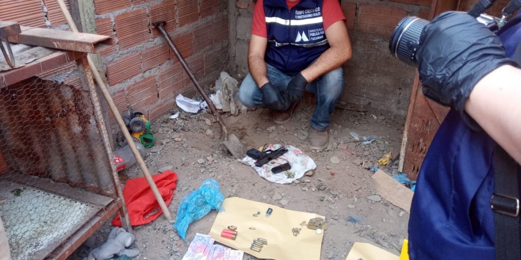 Los pesquisas comenzaron a cavar en el fondo de la propiedad al detectar presencia de tierra removida en algunos sectores, particularmente a la altura de un gallinero. De esa manera fue encontrada enterrada una pistola calibre 9 milímetros. La misma será sometida a las pericias balística de rigor por parte de los expertos de Criminalística del ECIF para establecer si se trata del arma homicida o no.