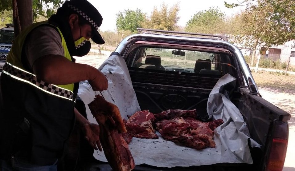 En la medida judicial realizada con colaboración de personal de la Comisaría de Los Gómez y la División de Delitos Rurales y Ambientales N°2, se logró secuestrar más de 400 kilos de presunta carne vacuna faenada, una camioneta Toyota Hilux, varios cuchillos carniceros y de otro tipo, y un teléfono celular.