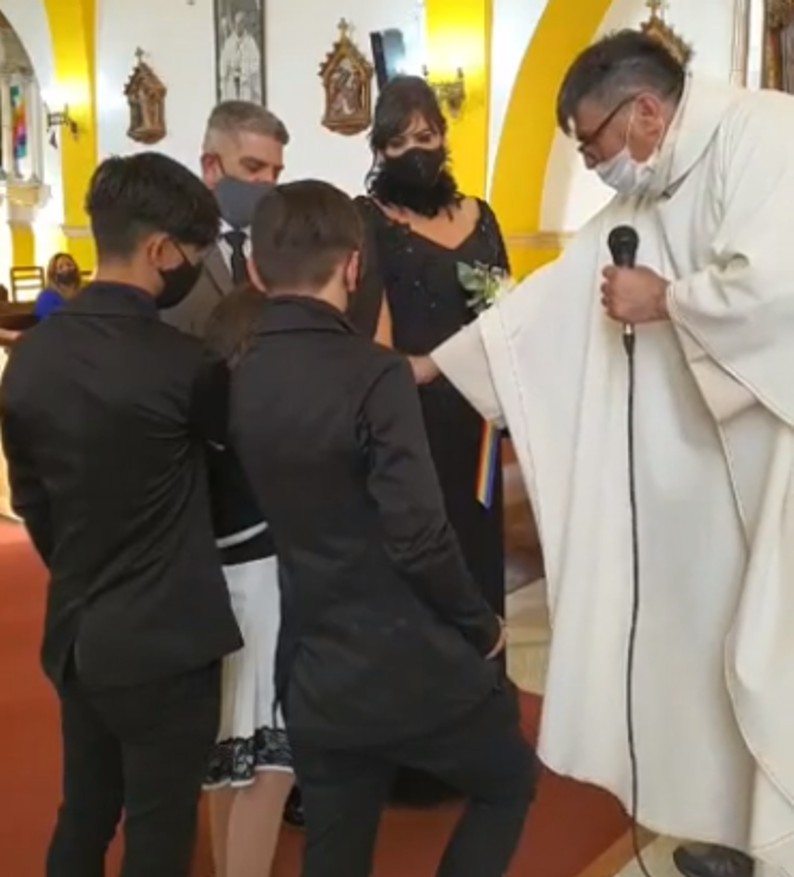 “Por eso lo pensamos como un acto de reconciliación y como un regreso a casa, en este caso la casa de Dios”, señaló Victoria, después de ingresar a la iglesia con la marcha nupcial, ante los 60 invitados. Lo hizo completamente de negro, en homenaje a “todas las compañeras que no pudieron cumplir con este sueño”.