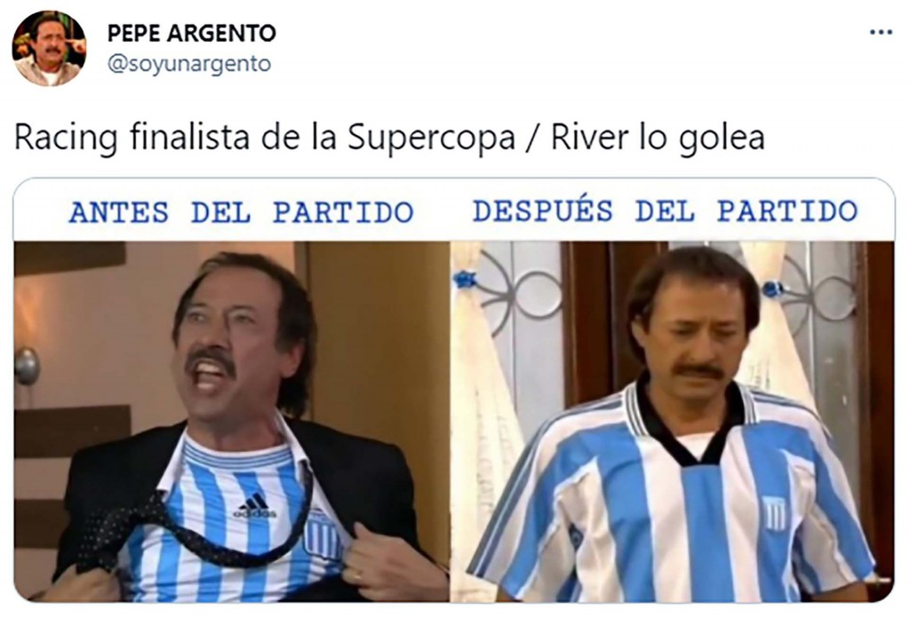 Como cada vez que Racing es noticia por un resultado deportivo, el actor y reconocido hincha académico Guillermo Francella aparece en las imágenes editadas que se viralizan. En esta ocasión también se mofaron de Pizzi, quien llegó a Avellaneda para reemplazar a Sebastián Beccacece y todavía no le encuentra la vuelta al equipo ya que a pesar de haber caído en esta final por amplia diferencia tampoco supo hallar la victoria en la Copa de la Liga (dos empates y una derrota en tres partidos).