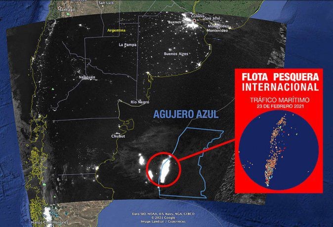 La alta concentración de los pesqueros se detecta en el Agujero Azul, localizado en el Mar Argentino entre la frontera de aguas internacionales y nacionales. Es un lugar codiciado por la industria pesquera por las características de su ecosistema marino, uno de los pocos en el mundo. Según Vueso, "entre la oscuridad de la noche, la luz que resalta en la satelital desde el Agujero Azul es más notoria que la del Gran Buenos Aires desde el cielo. Ahí el ecosistema marino está sitiado por la ciudad de buques pesqueros en alta mar que aprovecha el vacío legal de las aguas internacionales para incurrir en prácticas no reguladas, actos ilegales e incluso la violación a derechos humanos. Durante la expedición en nuestro barco Esperanza, evidenciamos ecosistemas marinos devastados y contaminación por la misma industria".