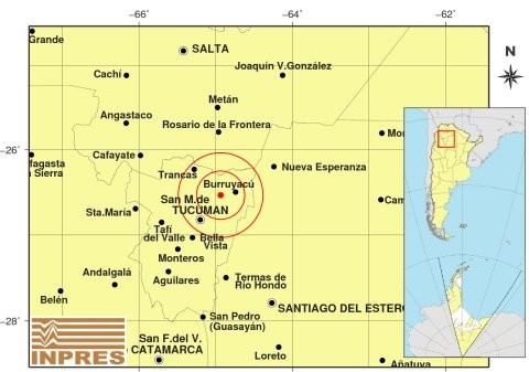 El epicentro del sismo se dio a 41 km al NE de San Miguel De Tucumán; 154 km al NO de Santiago Del Estero; 20 km al O de Burruyacú -26.534 (lat) -64.936 (long).