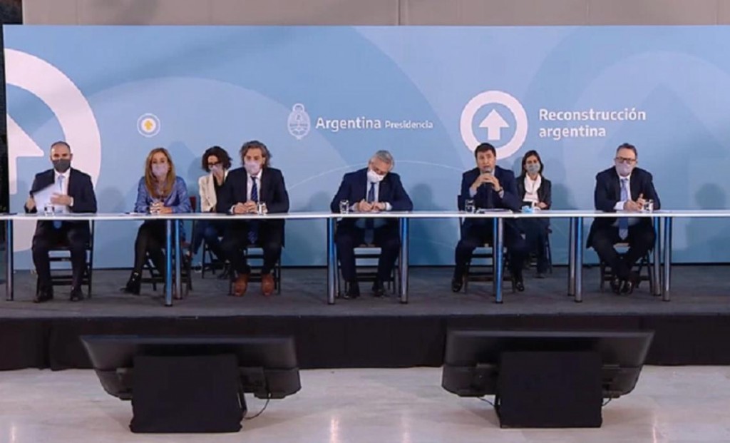 El mandatario estaba acompañado por los ministros Daniel Arroyo (Desarrollo Social), Martín Guzmán (Economía) y Matías Kulfas (Desarrollo productivo). También estaban presentes la titular de ANSES, Fernanda Raverta; la vicejefa de Gabienete Cecilia Todesca Bocco; y Victoria Tolosa Paz, del Consejo Nacional de Coordinación de Políticas Sociales.