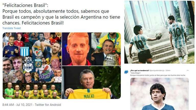 Desde temprano, en Argentina estallaron los memes y mufadas para Brasil. Es que esta noche se define la Copa América y ante la posibilidad de semejante logro, no hay herramienta que no sea válida para invocar a la buena suerte. Por eso, hubo dos frases que se hicieron tendencia irrefrenable en Twitter: "Hola Diego" y "Felicitaciones Brasil".