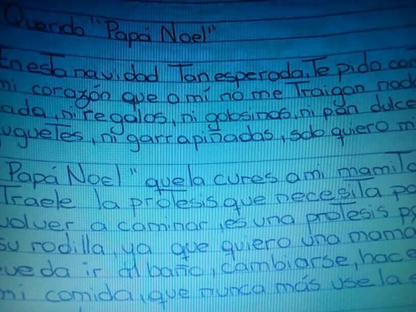 “Querido Papá Noel: en esta Navidad tan esperada te pido con todo mi corazón que a mí no me traigan nada de nada, ni regalos, ni golosinas, ni pan dulce, ni juguetes ni garrapiñadas, solo quiero mi amado 'Papá Noel' que la cures a mi mamita". "Traele la prótesis que necesita para volver a caminar, es una prótesis para su rodilla, ya que quiero una mamá que pueda ir al baño, cambiarse, hacerme mi comida, que nunca más use la silla de ruedas", continuó Maycol.