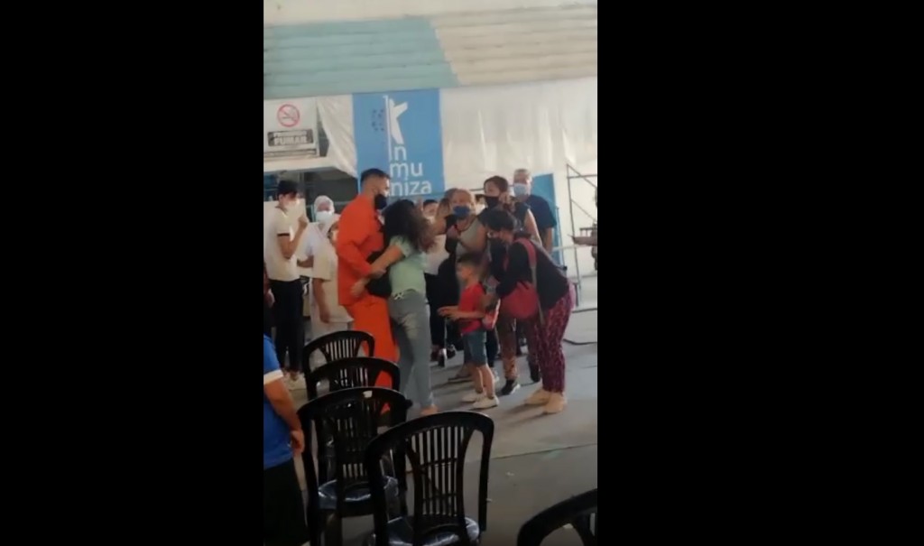 Según testigos, la madre de un niño que iba a ser inoculado oportunamente no quiso esperar en la fila que le habían asignado y empezó a agredir verbalmente a la agente de salud que justamente estaba tratando de calmar los ánimos de la señora.