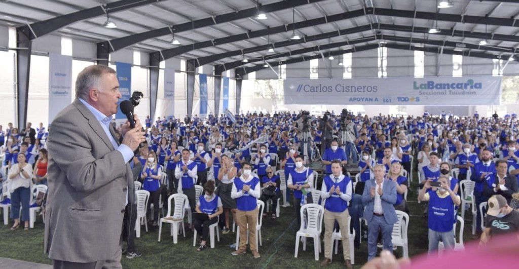 El gobernador Osvaldo Jaldo junto a los candidatos del Frente de Todos, Rossana Chahla, Agustín Fernández, Alejandro Melo, Pablo Yedlin, Sandra Mendoza, Sara Assan, participaron de los festejos por el Día del Bancario, en las instalaciones del Club Banco Provincia, donde recibieron el apoyo de La Bancaria de cara a las elecciones legislativas. Del encuentro participaron el diputado nacional Carlos Cisneros, el sub Interventor de la Caja Popular Hugo Ledesma, Cecilia Sanchez Blas, secretaria general de La Bancaria, seccional Tucumán. También asistieron, Regino Amado vicepresidente de la Legislatura, Silvia Pérez, secretaria general de la Gobernación, Gabriel Yedlin, ministro de Desarrollo Social, Sebastian Giobellina del Ente Tucumán Turismo, los concejales David Mizrahi, Gonzalo Carrillo y miles de empleados bancarios.