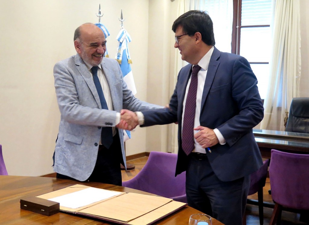 La firma del acuerdo se llevó a cabo en el edificio de avenida Sarmiento 431 con la presencia del ministro fiscal, Edmundo Jiménez, el ministro de seguridad, Eugenio Agüero Gamboa, junto a funcionarios de ambos sectores.