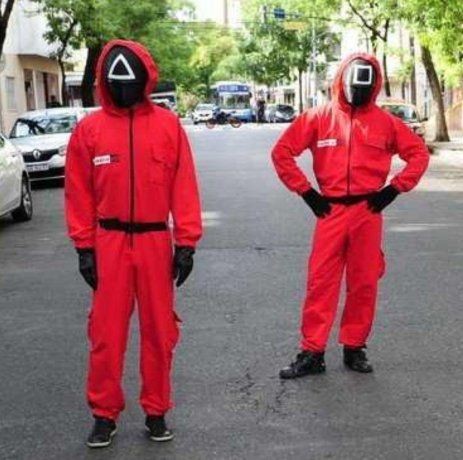Al menos así se sucedió en las afueras de la escuela donde voto el candidato Leandro Santoro, donde se pudo ver a dos personas disfrazadas con el característico overol rojo y las mascaras negras.