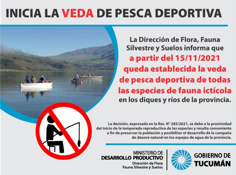 La Dirección de Flora, Fauna Silvestre y Suelos del Ministerio de Desarrollo Productivo de Tucumán informó que a partir del 15 de noviembre quedó establecida la veda de pesca deportiva sobre todas las especies en los diques y espejos de agua y cursos hídricos permanentes y temporarios del ámbito provincial.