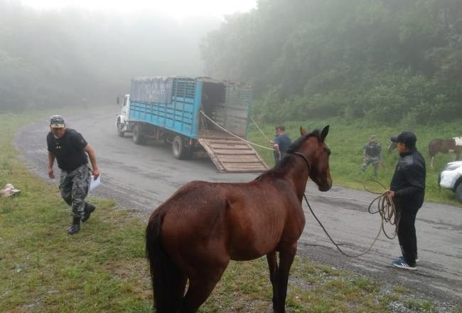 Los animales (dos yeguas, un potro y un potrillo) fueron cargados en el Camión Jaula de la Sección Caballería y trasladados directamente a esa Unidad Especial.