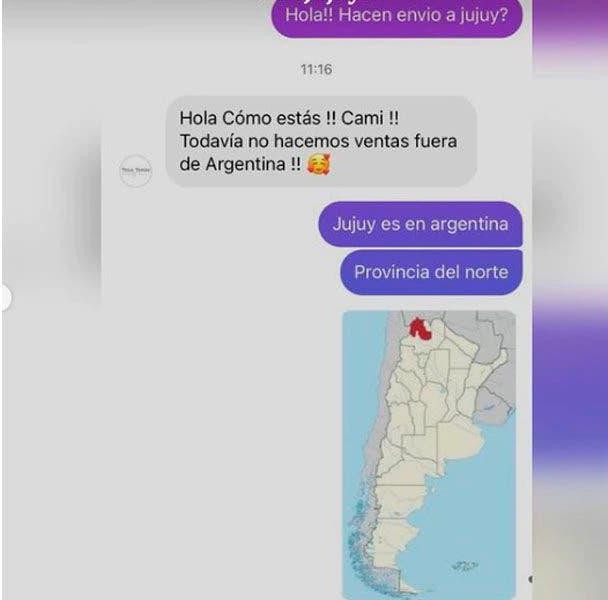 “Hola. ¿Hacen envíos a Jujuy?”, preguntó la mujer a través de un mensaje privado en Instagram al negocio porteño. Unos minutos después llegó la contestación que dio vueltas por todas las redes sociales.